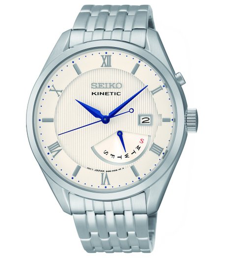 这款SEIKO 精工 男士 SRN055 人动电能石英手表 ,采用不锈钢表壳和表带,外观简约大气,气度非凡,彰显品牌魅力,蓝色指针,条形刻度,3点位置显示日期,四点和七点钟位置有小扇形显示星期,细节丰富,搭配SEIKO独家Kinetic人动电能技术,Kinetic把动能转换为电力,储存在内置电池里,结合了机械和石英的优点,充满后可独立运行6个月。
