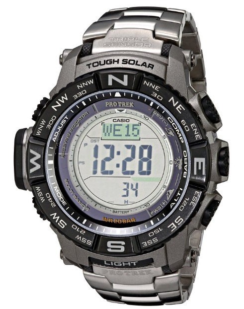 Casio 卡西欧PRW-3500T-7CR 光动能电波男士登山表,表带采用钛合金材质,不刺激皮肤并且非常轻,抗低温-10°。 采用了全新升级的卡西欧第三代三重感应器:数字罗盘、气压计和海拔高度计。官方宣称此款感应器体积缩减95%,耗电减少90%,并提高了测量精度。