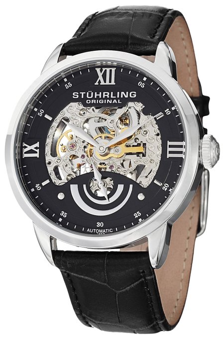这款施图霖Stuhrling Original男式574.02 Executive II全自动镂空黑色皮质表带手表,采用抛光不锈钢表壳,表镜为Krysterna水晶,防划伤,不锈钢罗马数字表盘,防水50米,黑色鳄鱼压花真皮表带。