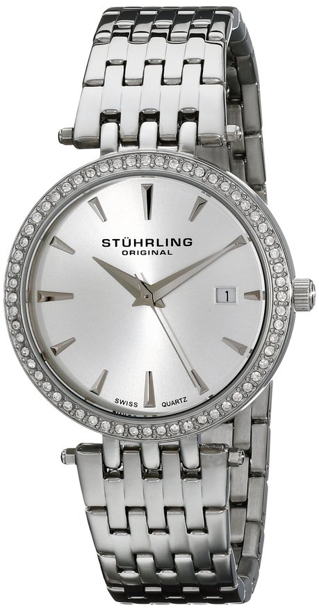 这款Stuhrling Original 斯图灵 579.01 瑞士石英施华洛世奇水晶银表,圆形腕表精钢七连手镯和施华洛世奇水晶的表圈镶嵌;模拟显示瑞士石英机芯;水晶表盘窗口;功能表盘,日期窗口,和折叠式表扣;防水深度50米(165英尺)。