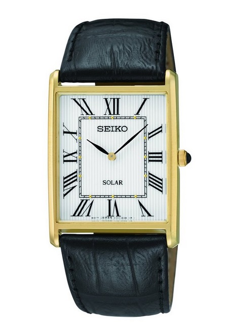 Seiko精工男士 SUP880 指针石英手表,日本原产石英机芯,太阳能光动力,无需更换能源!表面是黑色刻指针及刻度显示,镀金圆珠点缀,压纹小牛皮表带,镀金不锈钢扣头,手围约150-205mm,表带宽度约18mm,表壳为镀金不锈钢,镜面是矿石强化玻璃镜面,表壳尺寸为28mm*31mm*5mm,日常使用防水不成问题。