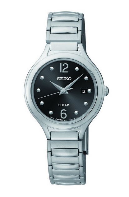 Seiko精工 SUT177 女士 时尚光动能手表,这款手表使用太阳能驱动,在任何可见光下都可自行充电,无需更换电池。充满电后可运行6个月!黑色表盘搭配不锈钢表壳和表带。十分典雅端庄!3点钟位置显示日历日期。表盘直径27.8mm。厚7mm。表带宽12mm。防水50米!