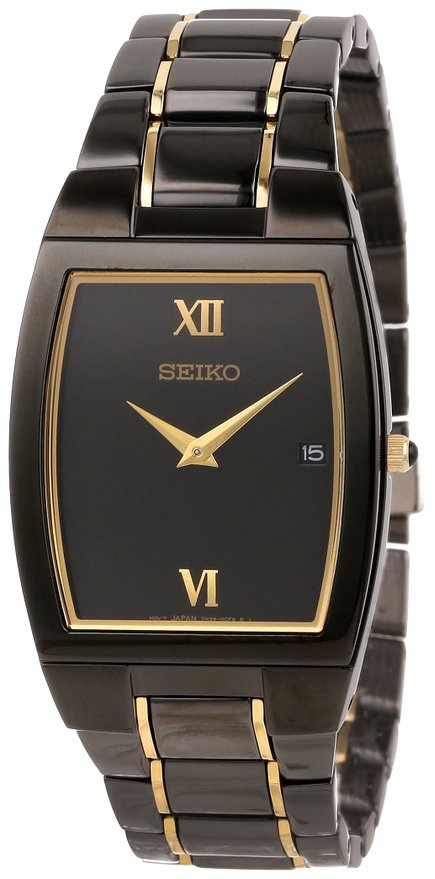 这款 Seiko 精工 SKP341 男士 全钢防水手表,内置精准日本石英机芯,高强化水晶表镜,黑金不锈钢表壳和表链,表壳直径33.5mm,黑色表盘,设计非常简洁,仅12、6点钟方向为罗马数字标识,3点钟方向有日期显示窗,金色时分指针,防水30m。