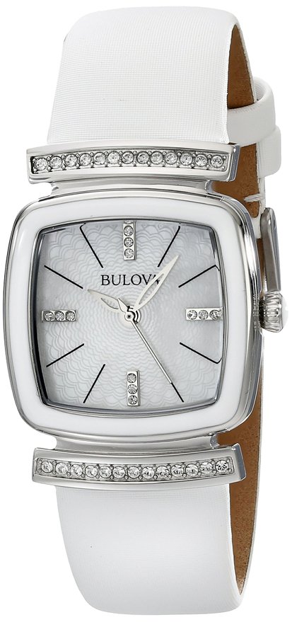 这款Bulova 宝路华 98L174 时尚女表,采用白色真皮表带,珍珠母贝表盘,表盘28mm,厚度为8.5mm,30米生活防水,3-6-9点钟镶嵌各有3可人造钻石,整体感觉比较小清新,适合送给小女盆友。