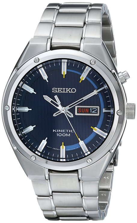 这款SEIKO 精工 SMY155 人动电能石英男表,采用精工Core人动电能技术/自动石英机芯5M83,既可以像自动上弦机械表一样通过手臂的摆动给电池充电,又具备石英机芯的准确性,充满电后最长可运行6个月,比机械表只能维持几天的动能储备强了很多,而走时精度达到每月小于15秒误差,也远超机械表。3点钟日历、星期显示,表盘直径为42mm,厚度为12mm,蓝色表盘搭配银色夜光指针和条形刻度,不锈钢银色表壳表带,抛光和拉丝表面,强化水晶表镜,旋入式透明底盖,防水深度100m。非常适合商务男士佩戴,大气实用。