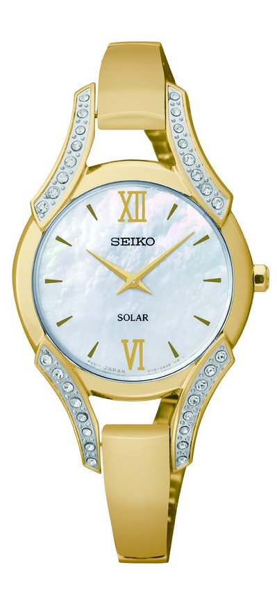 这款SEIKO 精工 珍珠贝母水晶太阳能女表内置V115太阳能石英机芯,利用自然光供能,无需电池,节能环保,防刮耐磨矿物玻璃表镜下为典雅珍珠母贝表盘,表盘上镶有针形刻度,金色时分指针,表带上镶嵌施华洛世奇水晶,表链连接处也镶有水晶,优雅高贵,表壳直径30mm,30m防水。