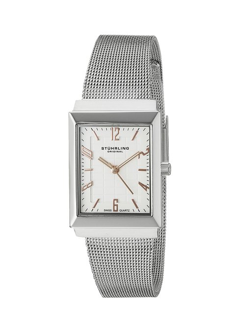 这款Stuhrling Original 8126L.12112 斯图灵女士经典超薄石英手表,内置优质瑞士石英机芯,保证了时间的精确,外观采用银色不锈钢网链搭配矩形表壳设计,端庄典雅,气质非凡,防刮耐磨矿物玻璃表镜下为白色表盘,表盘上镶有玫瑰金全时刻度,边缘精确到秒,夜光指针方便夜间读取,表盘直径23mm,防水深度50m。