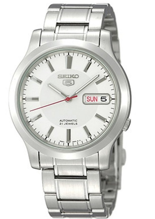 这款精工5号 SNK789 自动机械男表,采用表背镂空设计(性感的背透),SEIKO专业机械机芯,强化抗磨玻璃表面,全不锈钢表壳及表带,双按动式三折表带扣(表扣还有刻有SEIKO及5号机芯LOGO)。防水深度100米。