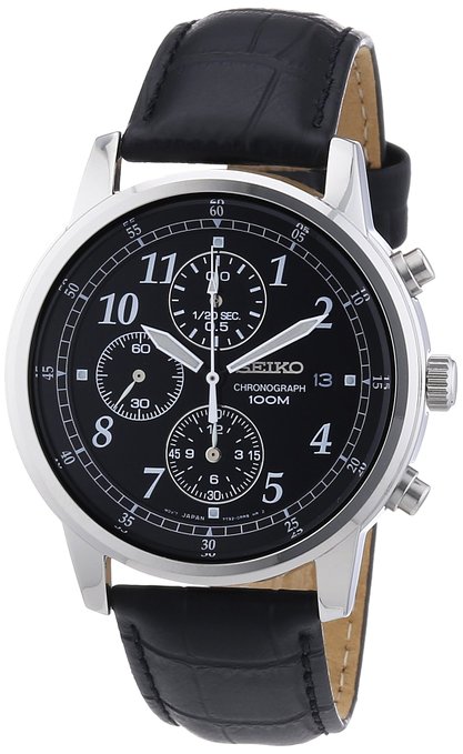 这款精工Seiko SNDC33男士经典计时石英手表,内置精确日本石英机芯,外观采用黑色真皮表带搭配银色不锈钢表壳设计,非常经典,防刮耐磨矿物玻璃表镜下为黑色表盘,表盘上镶有阿拉伯数字金刻度,边缘精确到秒,三眼计时表盘,夜光指针方便夜间读取,表盘直径40mm,防水深度100m。