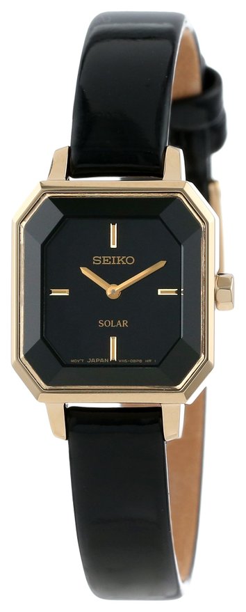 这款Seiko SUP198 精工女士时尚石英手表,内置精确日本石英机芯,利用自然光供能,无需更换电池,节能环保,外观采用黑色漆皮表带搭配金色不锈钢表壳,尊贵奢华,防刮耐磨矿物玻璃表镜下为黑色表盘,表盘上镶有金色刻度和制造,表盘直径27mm,防水深度30m。