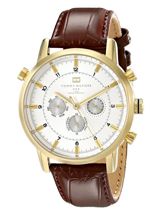 这款Tommy Hilfiger 男士1790874手表内置优质石英机芯,保证了时间的精确,外观采用褐色真皮表带搭配金色不锈钢表壳设计,经典尊贵,气质非凡,防划痕抗反射蓝宝石玻璃表镜下为白色表盘,表盘上镶有金色全时刻度,边缘精确到秒,三眼表盘实用方便,金色时分秒指针,表盘直径44mm,防水深度50m。