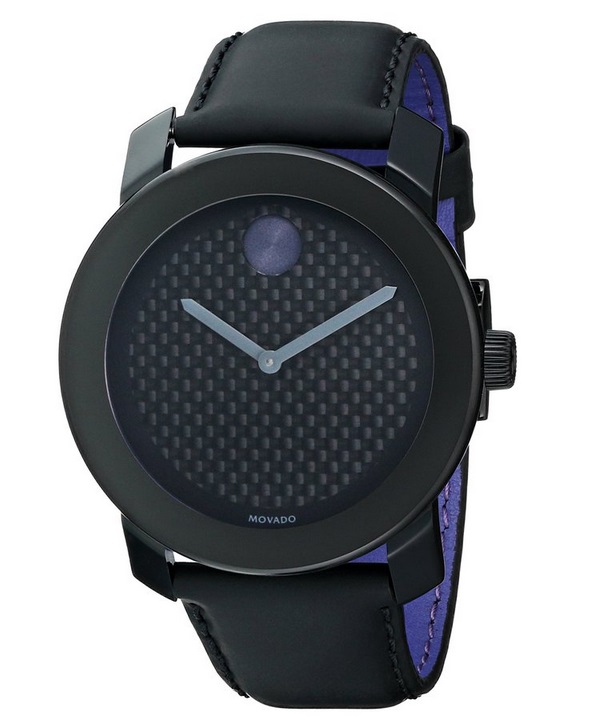 摩凡陀Movado Men's 3600170 Bold Analog Display Swiss Quartz Black碳纤维表盘男表,内置一颗瑞士石英机芯,走时精准,K1水晶玻璃表镜,防刮耐磨,采用TR90复合材料+不锈钢的表壳,造型前卫,具备金属化、纹理化的特点,皮质表带上有涂层,淡色双边走线工整,TR90/聚合链扣表链,精确瑞士石英机芯。抗磨损K1水晶。大号摩凡陀波特腕表,42毫米黑色TR90复合材料/不锈钢表壳,黑色碳纤维表盘饰以灰色纹理、灰色指针、灰色标志性圆点,黑色涂层皮质表带,搭配紫色衬里及黑色离子电镀不锈钢表扣,具备30米的生活防水能力。