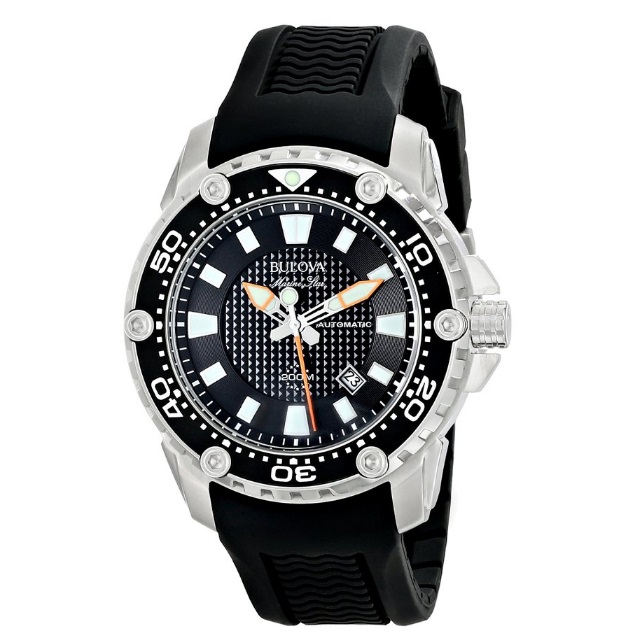 宝路华Bulova Men's 98B209 Stainless Steel Automatic Watch with Black Rubber Band 男款自动机械表,属于BULOVA Accutron宝路华臻创系列,是宝路华旗下的高端系列,号称真正的瑞士原厂制造。内置瑞士自动上链机芯,虽是入门级机械表,但依旧需要足够的工艺制造,同价位其他品牌只能买到石英的手表。不锈钢银色表盘搭配夜光刻度和指针,夜晚读时非常方便,外观整体比较运动时尚,表盘中部图案充满造型感。矿物水晶表镜防刮擦性佳,橡胶表带亲肤舒适,4/5点之间日期显示,表径47mm,厚度13mm,防水深度200米。