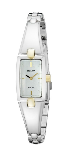 这款Seiko 精工 SUP218 女士时装手表 的表链和表圈都是不锈钢材质,表链很窄,手环形状的表带可以作为装饰,非常好看。表盘上没有数字,只有金色的指示标,简单优雅。白色表盘与金色搭配,指针是金色和黑色的,让手表不会太单调。表盘外部是宝石防刮玻璃。这款手表是一款石英表,内置日本石英机芯,走时精准,长久有效,强化Hardlex矿物耐磨表镜,防水深度为30米,可以应付日常生活使用。这款手表整体上比较纤细娇小,高贵奢华,配色低调,可以当作一款首饰来佩戴了,很容易就能搭配衣服。喜欢的美眉不要错过了哦!