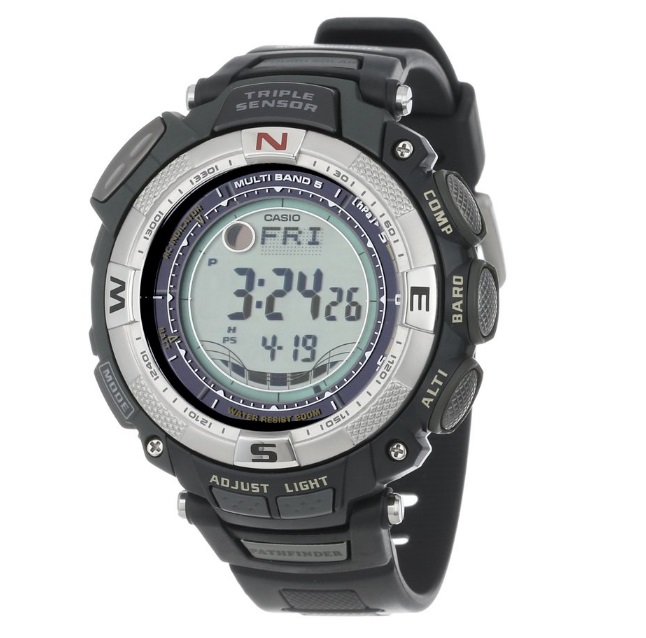 卡西欧 Casio PAW1500-1V Pathfinder 5局电波太阳能多功能手表, 多波段5局电波接收校时,太阳能充电系统, 国内话,可接收日本电波站,东部城市均可收到,西部等地可能就收不到了。内置方向感应器通过地磁进行罗盘指向、内置热敏电阻实现测温功能,内置测压感应器,测量当前气压值、通过内置硅片“阻力效应”感应当前高度;最高可以承受-10℃低温,带有月相显示显示 200米防水。单层LCD显示,13.9mm厚。 节能模式下可运行5个月。 200M防水