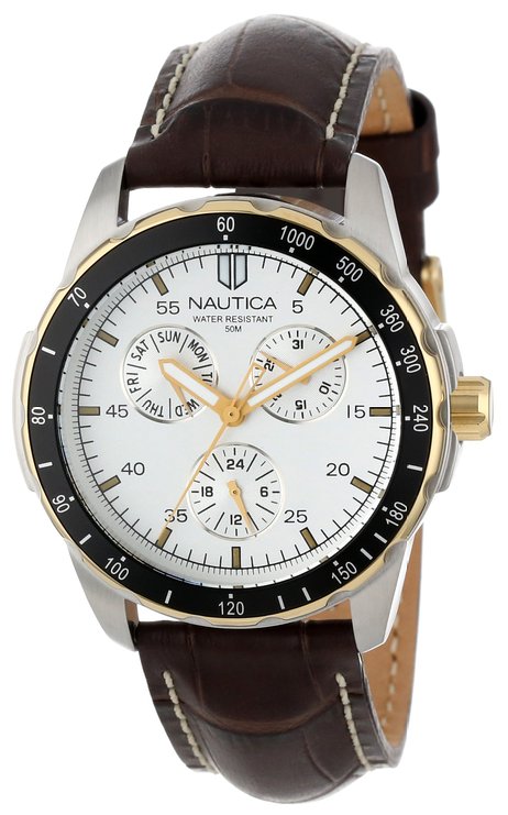 这款Nautica N11502G 诺帝卡男士Windseeker石英手表,内置精确日本石英机芯,保证了时间的精准,外观采用褐色真皮表带搭配金银配色不锈钢表壳,经典优雅,气质非凡,防刮耐磨矿物玻璃表镜下为白色表盘,表盘镶有金色全时刻度,边缘精确到秒,三眼日历副表盘,夜光指针方便夜间读取,表盘直径40mm,防水深度100m还是比较靠谱的,可以戴着游泳,日常的生活防水更是不在话下!