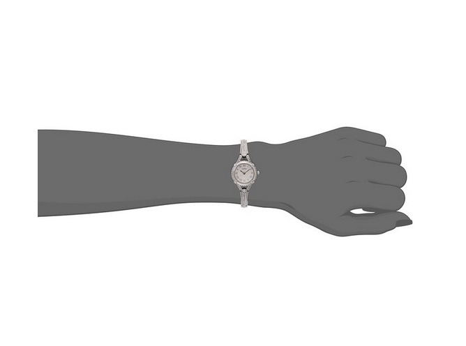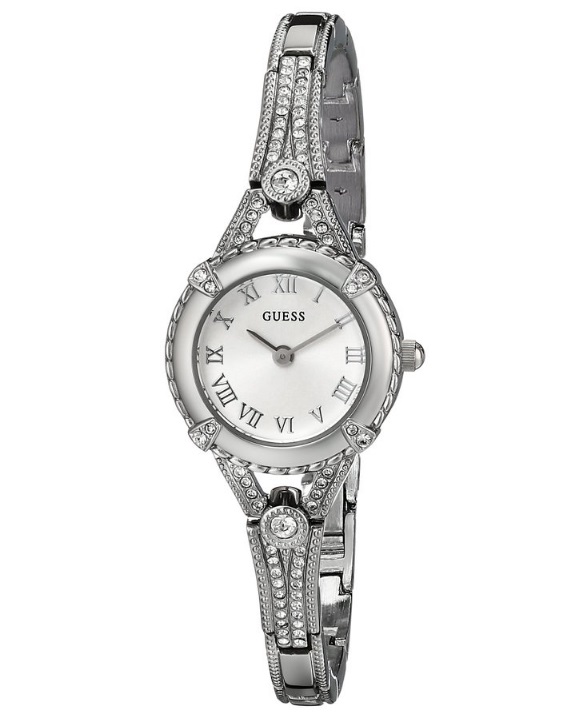 盖尔斯GUESS Women's U0135L1 Petite Vintage-Inspired Embellished Silver-Tone Watch水晶镶嵌造型女士石英手表,GUESS的这一款女式时尚手表,表壳直径22毫米,厚度6毫米,舒适美观,比较纤细,完全可以当作一款手镯来佩戴。不锈钢制成的银色表带搭配银色表盘,表带和表盘都镶有钻石点缀,手镯式的表带设计,既有实用性又有装饰性,矿物玻璃表镜简洁流畅。希腊数字显示12个刻度,中间GUESS的标志显得更有金属质感以及配有一定的质量保证,防水10米。无论是出席正式场合还是休闲佩戴,都能帮助显现女性独特的时尚高贵气质和不凡的眼光。