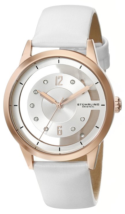这款斯图灵Stuhrling Original 946L.02女士时尚石英手表,内置精确日本石英机芯,保证了时间的精确,外观采用白色真皮表带搭配金色不锈钢表壳设计,奢华不失优雅韵味,时尚优雅,气质非凡,款式简洁大方,防刮耐磨矿物玻璃表镜下为银色表盘,部分采用镂空设计,表盘镶有水晶刻度,玫瑰金时分秒指针,表盘直径36mm,防水深度50m,足够日常使用了,适合日常佩戴。