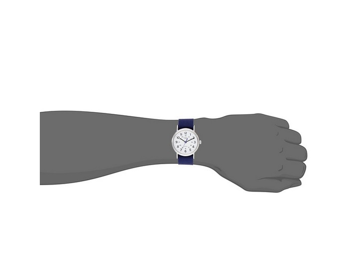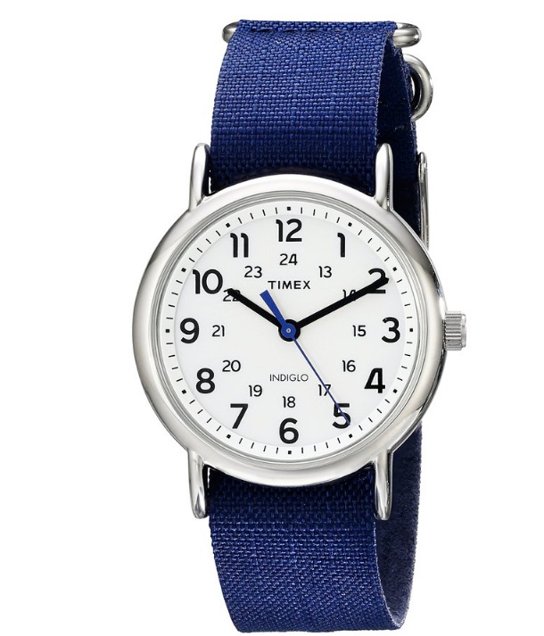 天美时Timex Unisex TW2P658009J Weekender Silver-Tone Watch with Blue Nylon Band 男款休闲石英手表,属于天美时非常著名的Weekender周末旅行者系列手表,这个系列的手表都是中性款式,走的是文艺校园风路线,蓝色帆布表带,搭配银色不锈钢金属表壳,圆形表壳颇具复古文艺情调,白色表盘上的黑色时间刻度也用了复古的字体,矿物玻璃表镜,比较耐刮,38mm表径,大小适中,无论男女皆可佩戴,内置一颗石英机芯,走时比较精准,搭配了Indiglo夜光灯,Indiglo是 Timex公司独创的核心技术——一种亮度极大的夜光灯。日常30米防水,可以防止生活中的溅水或者下雨!
