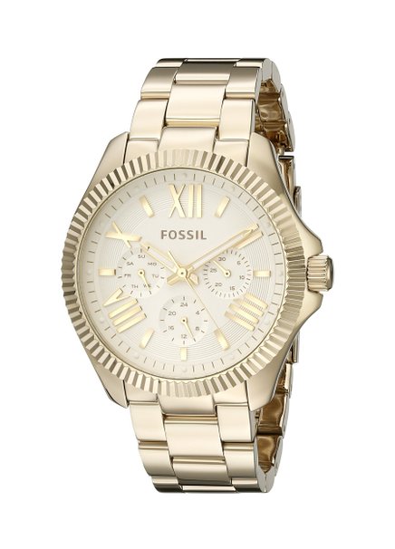 这款Fossil AM4570 化石女士时尚石英手表,内置优质石英机芯,保证了时间的精确,外观采用金色全钢表壳表链设计,尊贵优雅,气质非凡,防刮耐磨矿物玻璃表镜下为白色表盘,表盘上镶有金色全时刻度,边缘精确到秒,三眼日历表盘,夜光指针,方便夜间读取,表盘直径40mm,防水深度100m还是比较靠谱的,可以戴着游泳,日常的生活防水更是不在话下!款式简洁大方,佩戴起来很时尚,十分惹眼,非常适合女孩子佩戴,是配饰佳品!