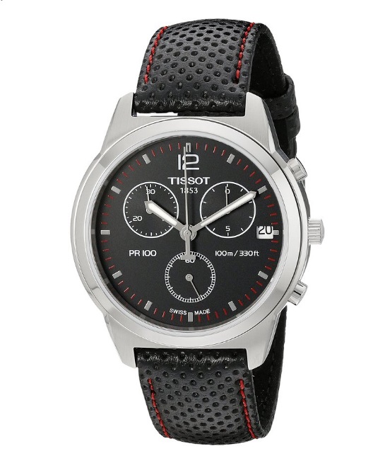 天梭Tissot Men's T0494171605700 PR 100 Black Chronograph Dial Watch PR100米防水瑞士三眼计时男表,内置一颗瑞士石英机芯,走时精准,款式采用大气青春的三眼设计,然后加上浓墨重彩的配色黑红配,彰显了一种青春活力的运动气息,与此运动风格搭配的表带也采用了穿孔设计,与一般天梭石英表略带严肃的表带设计截然相反,充满了年轻的活力。在3点钟位置有日历显示,表针带有夜光,方便使用。银色不锈钢材质的39mm表径的表盘,对一般的男生的手来说差不多,不会很大,要说太小也不会,100m的生活防水,日常使用毫无鸭梨。