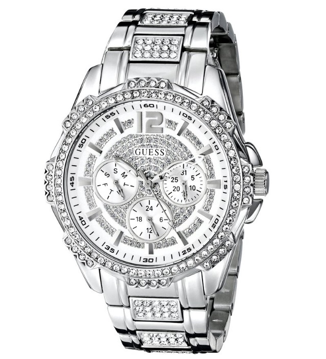 盖尔斯GUESS Women's U0286L1 Silver-Tone Glitz Watch with Link Bracelet 女式镶钻时尚手表,一款超级奢华的手表,光从外表就可以感受到它的高贵典雅,镶钻的表壳表带,晶光闪闪,如果在灯光下的话能看到更加绚丽的效果哦,犹如插画般的表壳图案,与镶嵌的碎钻非常搭配,将整块手表的外形提升了多个档次。具体参数方面,内置一颗石英机芯,走时精准,39mm表径大小适中,适合多数女士的手腕,银色不锈钢表壳与表带,与整个银色指针刻度和白色表盘都相得益彰。另外还拥有100米防水的能力,戴着游泳毫无压力!