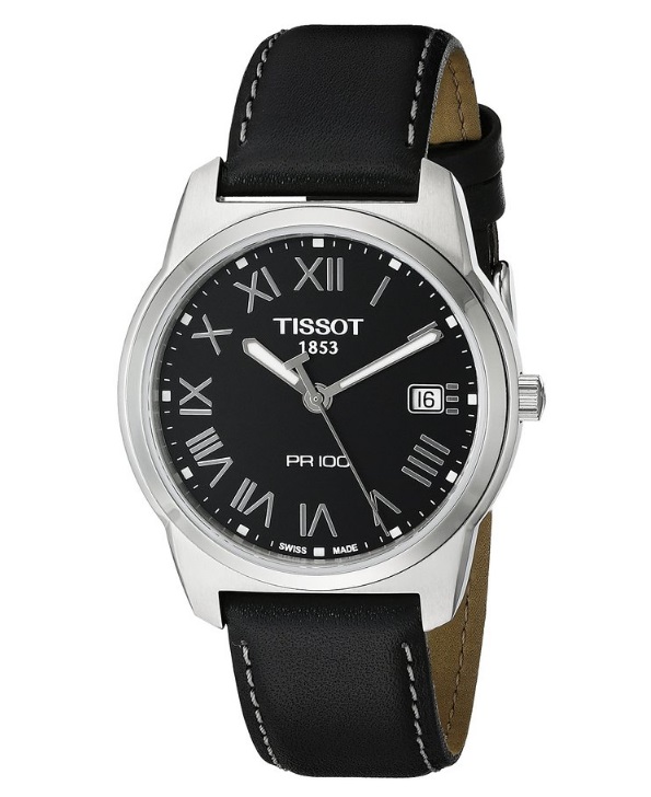 天梭Tissot Men's T0494101605301 PR100 Black Dial Watch 黑色表盘瑞士100米防水男表,这款PR100是天梭旗下T-Classic经典系列,采用38mm原型表盘,粗细适中,适合绝大多数男士佩戴。黑面白针罗马数字小时刻度,真皮表带,日期显示,约利落的表盘设计,银白色大三针及罗马时标在黑色表盘的映衬下显得格外醒目,搭配耐磨损蓝宝石水晶镜面,质感十足。机芯使用大众化的瑞士原产QUARTZ 805.112石英机芯,3-5年精准度绝对不容置疑,3点钟日期显示,夜光指针,100m防水,可以 戴着去游泳池里游泳,毫无压力。