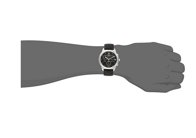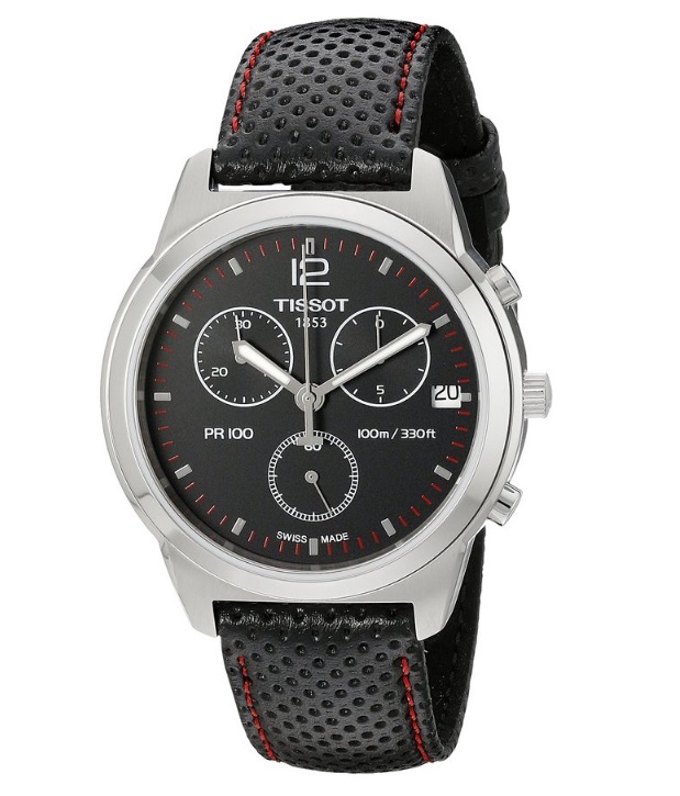 天梭Tissot Men's T0494171605700 PR 100 Black Chronograph Dial Watch PR100米防水瑞士三眼计时男表,这是一款具有浓浓赛车运动风格的手表,从它的外形上就可以看得出来。皮质表带上的透气孔设计得井然有序,颇有赛车运动员比赛服的感觉,都体现出了一种严谨,其实手表和赛车也有很大的相似度,都是靠精密的零件带动运转,所以这款运动型的手表就更是男士了,具体参数方面,采用经典三眼设计,配色上采用了黑色为基色,配色红色,透出强烈的运动风采,3点钟位置有日历显示,表针带有夜光,方便使用。39mm的表盘直径,100m防水。