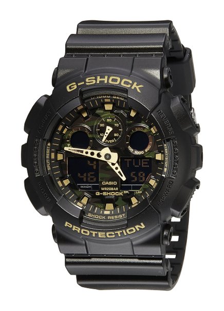 Casio卡西欧G-Shock 推出的一款迷彩系列——全新的「Camo Dial」系列超人气指针数位双显表款,这款Casio 卡西欧男子 GA-100CF-1A9CR 经典G-shock系列双显防水迷彩手表,以深色调的黑/灰色为主,表盘采用金属光泽的迷彩纹路,指针与时刻辅以金/银/灰设计,展现无法忽视的街头时尚魅力,55mm的大表径设计更加增添了粗犷的男性魅力!同时它还具备耐冲击构造、高亮度 LED 照明、抗磁、1/1000秒计时码表、倒数计时等多项功能!防水200米很靠谱,日常生活防水不在话下。