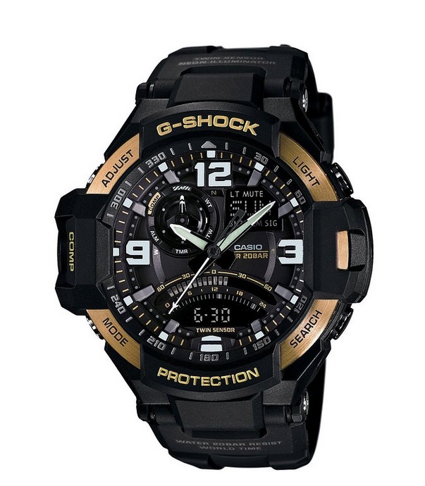 卡西欧Casio G-Shock GA1000-9G 男款手表,GA-1000黑x金酷炫新色登场,首次结合数字罗盘功能的Gravity Defier飞行表款,在视觉及功能上皆紧密地与航空连结。在任何模式中按下9点方向的罗盘按键即能立即进入方位指示,而按下8点方向的模式按钮后即可回到原本所处的模式。在方位指示模式中,秒针指向北方,上方液晶屏幕显示12点位置所指的方位,下方液晶屏幕则会显示方位度数。表款并具备方位记忆功能、温度测量、世界时间、1/100计时秒表、倒数计时等多项功能。左上方表圈内的指针采用飞机造型,强悍机能外亦增添了使用上的乐趣。