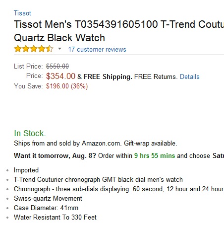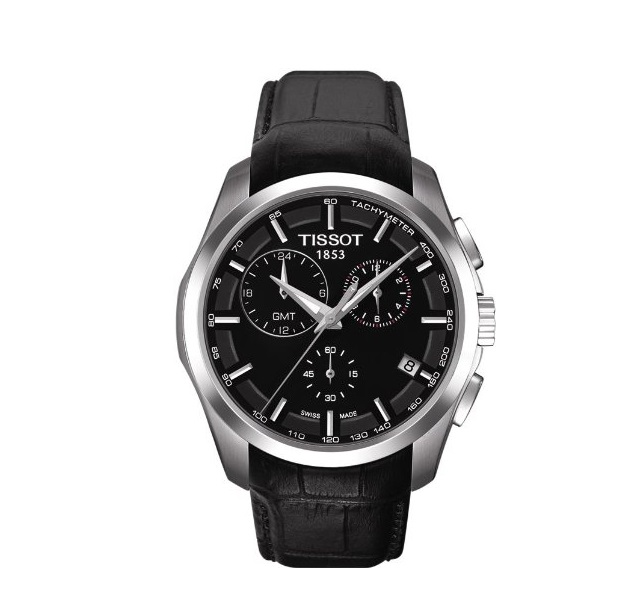 天梭Tissot Men's T0354391605100 T-Trend Couturier Analog Display Swiss Quartz Black Watch建构师系列男士石英手表 ,这款手表属于天梭石英表中比较高端的Couturier建筑师系列,从它的外形就可以感受到高端的感觉,黑色皮革表带,搭配银色不锈钢金属表壳,表盘也采用了冷酷的黑色,三眼计时设计,不同大小和刻度式样,从细节处彰显品质的完美,表盘外圈还有视距仪功能,4点处有日历功能,时针和分针上带有夜光功能,方便夜间看时间。表盘大小为41mm,适合多数男士的手腕,100米防水也很不错!