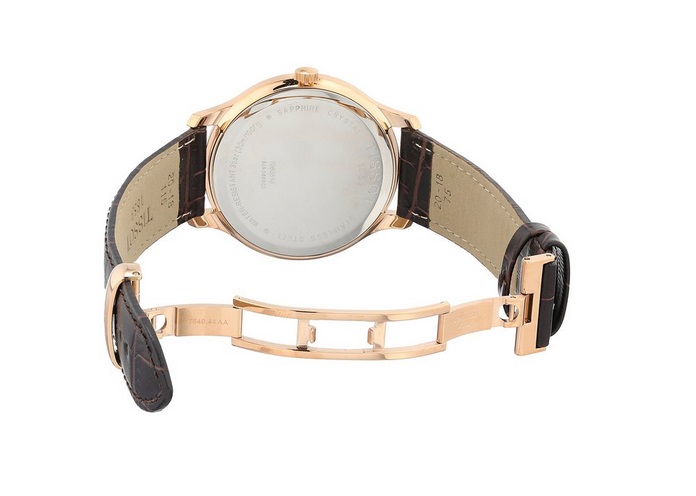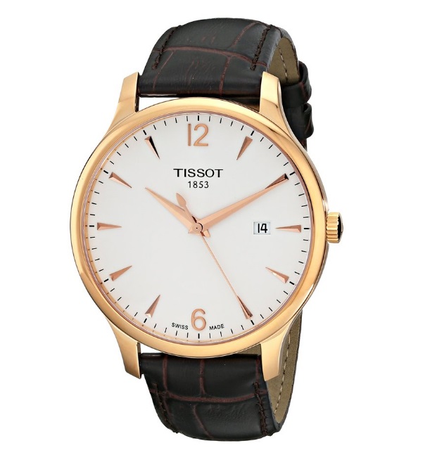 天梭Tissot Men's TIST0636103603700 Tradition Analog Display Quartz Brown Watch玫瑰金俊雅系列传承瑞士男表,天梭在国内知名度挺高的,这款表,采用真空镀膜技术处理的玫瑰金(18K金)的表壳和刻度盘、指针,搭配棕色真皮表带,表盘42毫米大,看起来就很霸气。防水能力也不错,30m防水,没事儿没人会去潜水的,而且潜水到30米以下基本上是极度不可能的事情。具体参数方面:采用不锈钢表壳搭配棕色皮表带,固定玫瑰金PVD表圈,外观十分好看,内置一颗石英机芯,保证了时间的精准,表壳直径: 42毫米,防水深度达99英尺。