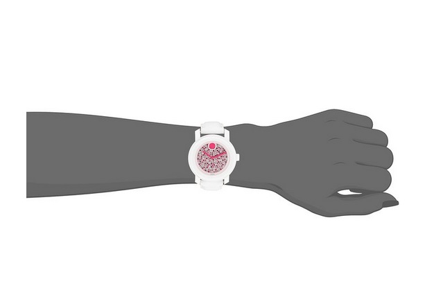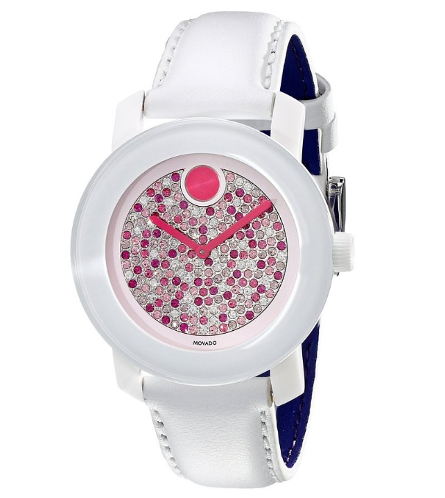 摩凡陀Movado Women's 3600262 Bold Analog Display Swiss Quartz White 瑞士制造K1全水晶镶嵌女表,光从外观从就可以看得出这款女表的奢华,采用K1水晶,镶嵌整个表盘,而且不同于同系男表单色的水晶,这款女表粉色、粉紫、白色等多色水晶镶嵌其中,搭配粉色的摩凡陀标志性大圆点,以及粉红色指针,特别适合小女生使用,十分的闪耀出彩,让人想不瞩目都难啊!具体参数方面,内置一颗瑞士原产石英机芯,走时精准,白色皮革表带搭配银白色表盘,36mm表径,适合大多数女声的手腕大小。30米防水,适合日常生活中的防水!