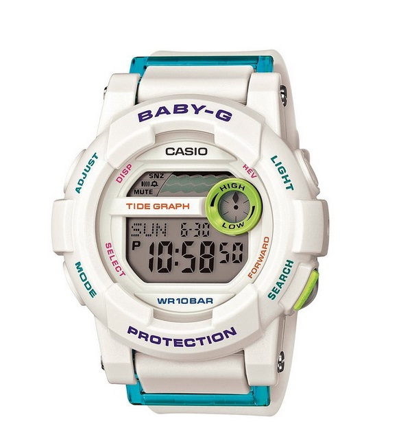 卡西欧Casio Women's BGD180FB-7 Urban Glide Series - White 时尚运动款大表盘女表,时尚大表盘运动表款。表款以全液晶方式呈现,潮汐状态放在表盘上方,展现活力十足的户外运动风。主要功能:防震、100M防水LED照明、世界时间(48个城市)、潮汐图、倒计时、多功能闹铃,整点响报, 间歇响报、全自动日历、12/24小时时制、按键音开关。