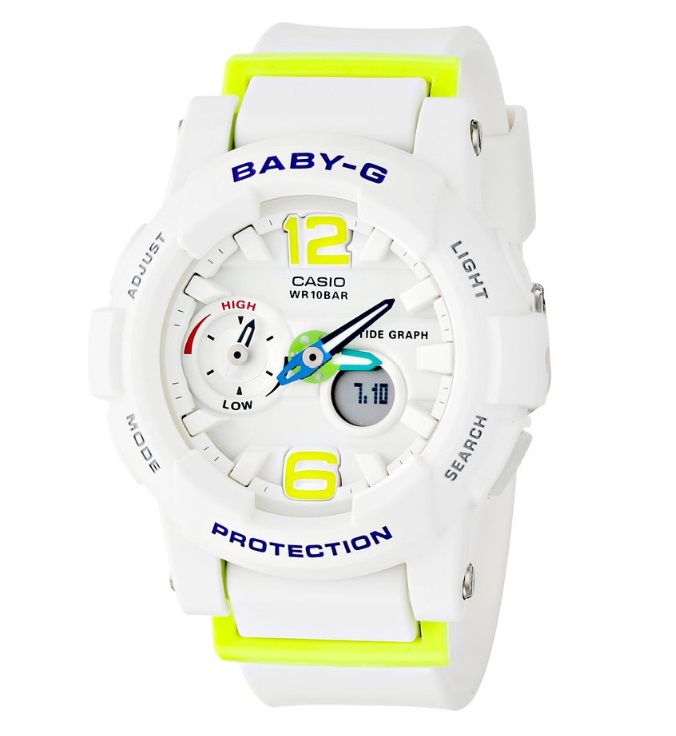 卡西欧Casio BGA180 Baby-G时尚女表,BGA-180系列拥有与以往任何一款腕表都不同的“突起式保护杆(LUG PROTECTION)”。使用了新型树脂材质的保护杆,不仅呈现多层次材质的运动外观,更可承受较大的冲击力以保护腕表与表带的连接,以及对手表背壳的直接冲击。传统4键设计的功能按钮此次做了特别的升级。4点钟位置的“一键模式”按键被染上与其他3键不同的颜色,同时增大了按键的尺寸。在任意模式下,想要了解潮汐信息,直接按下此键即可轻松获得!9点刻度位置的小表盘将简洁直观的显示潮汐的强弱。多层次3D立体表盘的时尚设计,让喜爱BABY-G街头风格的女生,拥有更动感的选择!