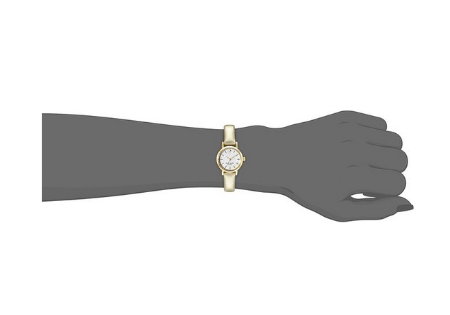 凯特丝蓓kate spade watches Gold Tiny Metro 真皮时尚女表手表,来自时尚大牌kate spade的一款时装表,光从外形上就可以感受到它浓浓的潮流时尚感,金色真皮表带搭配金色金属表壳的配色,让它显得高贵典雅,表盘则采用了白色为底色,搭配黄金色指针和刻度的设计,与表带表壳交相呼应,12点处用kate spade的黑桃标志替代,彰显品牌魅力,6点上方则为kate spade new york的字样,象征品牌。20mm的表径十分纤细小巧,基本可以把它当做一款手镯来佩戴,同时具有一定的日常防水能力,总的来说是一款不错的时装表!