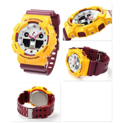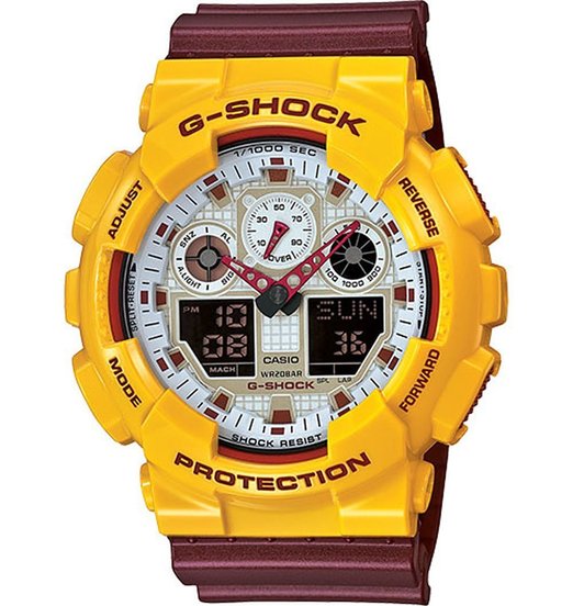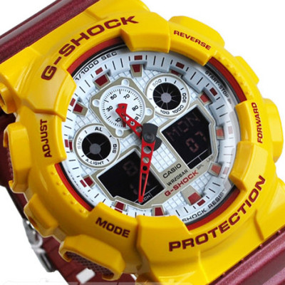 G-SHOCK夏日亮彩新设计,採用超人气指针数位双显GA-100/GA-110系列表款,抢眼对比跳色设计,共有GA100CS的黑X白与金属紫红X黄与GA-110CS的红X金色三种选择,其中GA-100CS採用跳色反转液晶萤幕设计,掀起夏日街头时尚新浪朝!具备耐衝击构造、防水200米、LED照明、世界时间、1/1000秒计时码表与倒数计时等多项功能。
