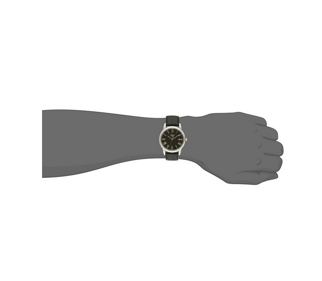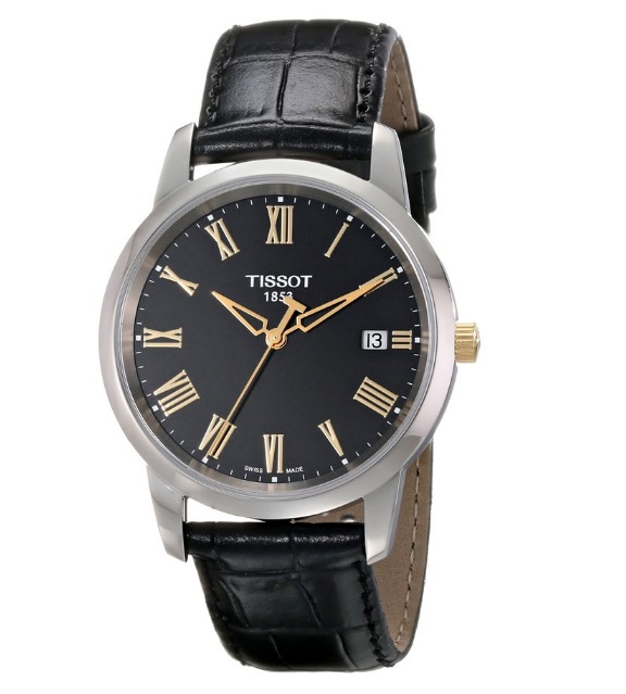 天梭Tissot Men's T033.410.26.053.01 Swiss Quartz Movement Watch 瑞士造超薄黑盘金针,来自天梭的一款手表,内置一颗瑞士原产的ETA 805.112石英机芯,走时比较精准,一般一年的误差也就数秒钟,黑色皮革表带搭配银色不锈钢表壳,38mm表径比较纤细,适合多数男士的手腕,戴上去之后能够完美搭配各类商务或者休闲服饰,精钢材质的表壳触感也很不错,黑色表盘上是金色的罗马数字刻度,复古典雅的味道油然而生,与金色指针相得益彰,3点处有日期功能,12点下方是TISSOT 1853的字样,象征了天梭160多年的辉煌历史,30米防水!