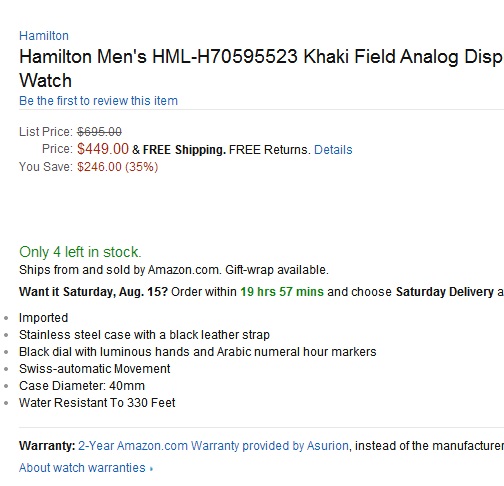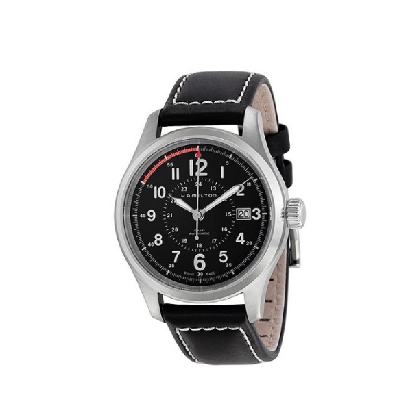 汉密尔顿Hamilton Men's HML-H70595523 Khaki Field Analog Display Swiss Automatic Black Watch 卡其瑞士自动机械男表,这款是来自汉密尔顿的一款机械手表,外观上采用了银色不锈钢表壳搭配黑色皮表带的设计,表带上还有一圈白色缝线,圆形表盘40mm直径,大小适中,多数男士的手腕捷克佩戴,表圈刻度上有1/6圈涂成了红色,指针带有夜光功能,方便夜晚看时间,3点处有日期功能,内外双刻度设计,外圈12小时,内圈24小时,内置自动机械机芯,在这个价位里面算是很不错的选择了,防水深度有100米,能够戴着游泳!