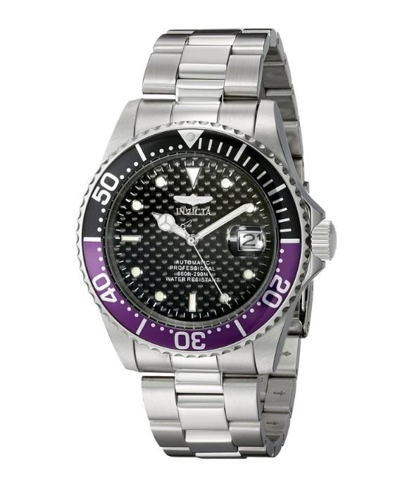 因维塔Invicta Men's 18159 Pro Diver Analog Display Japanese Automatic Silver Watch 男款全自动机械潜水表,Invicta的手表一向以质量优异著称于世,比如推荐的这款手表,内置一颗日本产的自动机械机芯,作为千元价位的机械手表,本款的表现可谓称得上物有所值。银色不锈钢表壳,搭配43mm表径的表盘,表盘设计比较个性,上半部分为黑色,下半部分为紫色,耐磨矿物晶体表镜,搭配银色指针,12点下方有Invicta商标,下方还标识有200M防水的字样,戴着潜水也毫无压力!必爱盘上的点缀装饰物也很时尚!