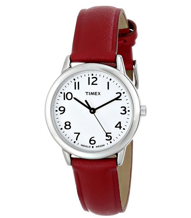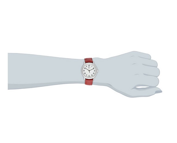天美时Timex Women's T2N952 Elevated Classics Dress Red Leather Strap Watch 经典时装女表,本款手表是一款外形相当出色的时装表,复古红色化的皮质表带看上去颇具质感,让整款表的外观都提升了一个档次,银色不锈钢表壳搭配白色表盘,黑色数字刻度作了复古字体处理,细细的指针与数字刻度搭配相当合适,12点下方有TIMEX品牌字母logo,6点下方的小字显示了防水30米,能够应付日常生活中的溅水、下雨等情况,还带有Timex公司独创的核心技术Indiglo夜光灯,这是一种亮度极大的夜光灯,保证夜里也能无压力看时间!