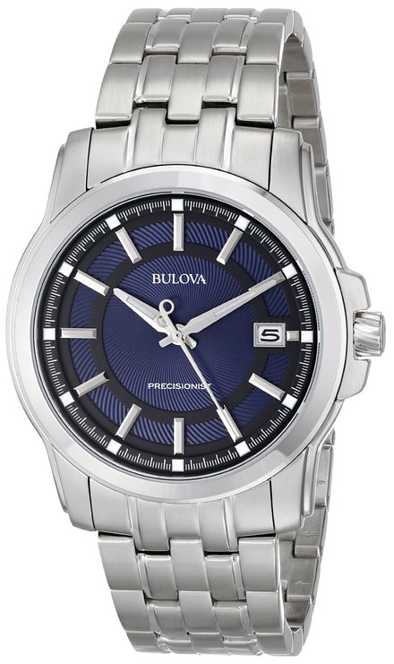 这款Bulova 96B159 Precisionist 宝路华男士全钢石英手表,内置精确日本石英机芯,确保了时间的精准,外观采用银色全钢表壳表链设计,沉稳优雅,气质非凡,防刮耐磨矿物玻璃表镜下为蓝表盘,表盘上镶有银色全时刻度,边缘精确到秒,3点钟方向为日历显示窗,夜光指针方便夜间读取,表盘直径42mm,防水深度30m,足够应付日常生活防水。