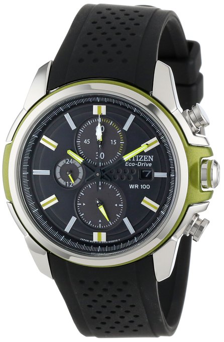 这款Citizen 西铁城 CA0427-08E 三眼光动能计时码表,设计上比一般的西铁城手表加入了时代的因素,非常酷的绿色这款表更加符合年轻人的口味。表盘布局非常干净,易于阅读。绿色偶数刻度和指针使得手表非常有个性。电镀的绿色采用西铁城专利的色度加工技术“Chroma finishing”,非常耐用,防刮。44.5mm不锈钢表壳搭配41mm黑色表盘,黑色树脂表带,表壳厚度仅11mm。耐磨防反光矿物玻璃表镜。内部采用B612 Eco-Drive光动能机芯,吸收日常可见光作为能量来源。功能包括日历、12/24小时显示、数字照明、1/5秒、60分计时,防水深度100米。