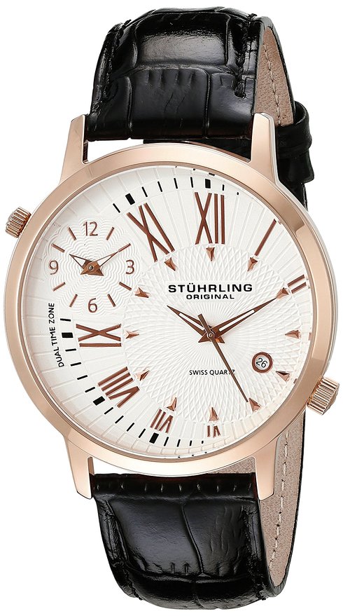 这款Stuhrling Original 斯图灵 343.33452 男士 玫瑰金石英手表,内置精确日本石英机芯,外观设计上秉承了其天马行空的非对称式设计,黑色鳄鱼皮纹表带搭配16K玫瑰金表壳,高贵有档次,防划痕高强度Krysterna水晶表镜下白色不规则花纹表盘,表盘设计也是这款手表最大的亮点,罗马数字的大尺寸刻度,双时区副表盘,4点钟方向拥有日历显示,夜光指针,设计极具特点,表壳直径47.7mm,50m防水。