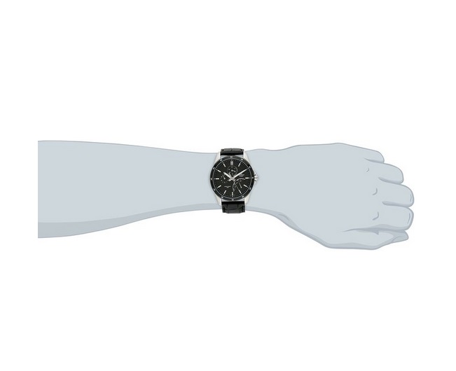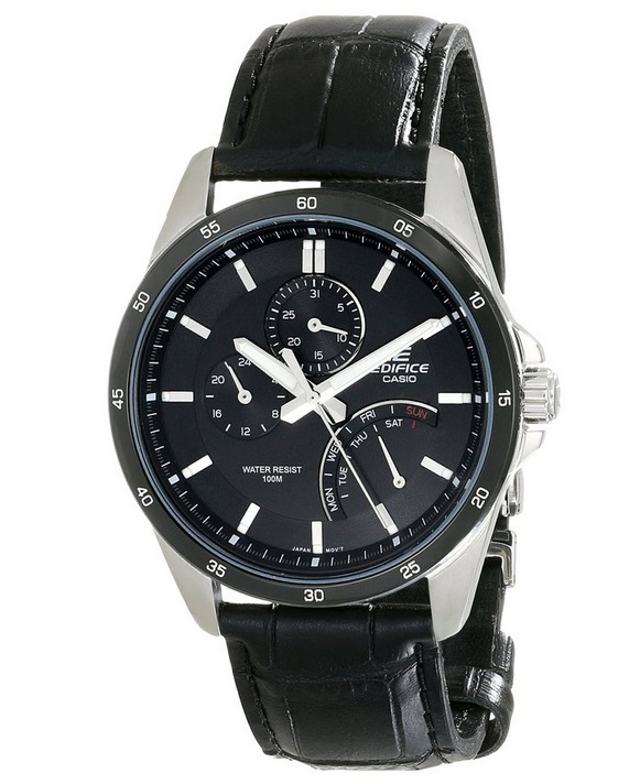 卡西欧Casio Men's EF-341L-1AVDF Edifice Analog Display Quartz Black Watch石英男表,EDIFICE经典三表眼设计表款,圆弧形的可逆跳星期指针位于5点钟方向,9点钟表眼显示24小时制,12点钟表眼显示日期,表圈经过离子IP处理,整体设计简洁大方,适合日常佩戴。具体参数方面,44mm表盘直径,比较大,适合型男的粗手腕,内置一颗石英机芯,走时精准,精钢不锈钢材质的表盘帅气非凡,黑色与银色搭配,三眼计时具有赛车仪表盘的感觉,搭配黑色皮革表带,指针刻度上还有夜光功能,日期框设计也很独特!