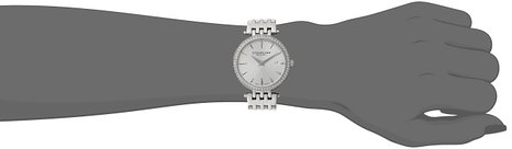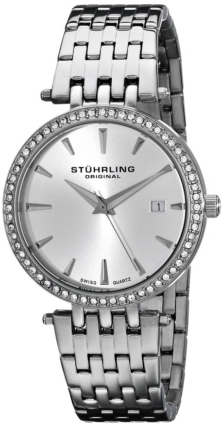 这款斯图灵Stuhrling Original 579.01女士时尚石英手表,内置优质瑞士石英机芯,保证了时间的精确,外观采用银色全钢表壳表链设计,表框周围镶嵌水晶,晶莹剔透,奢华闪耀,防刮耐磨矿物玻璃表镜下为银色表盘,表盘镶有银色全时刻度,3点钟方向为日历显示窗,银色时分秒指针。表盘直径34mm,防水深度150m,一般来说,适合休闲冲浪、潜水、水上运动,但不是潜水。日常生活防水不在话下。