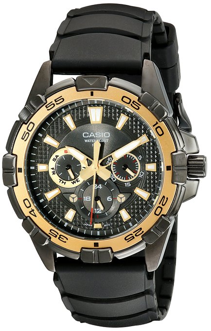这款Casio 卡西欧 MTD1069B-1A1 男士运动手表,采用矿化玻璃镜面,不锈钢表壳,外表圈电镀黑离子图层,冲击孔面板设计表盘,夜光显示,读时清晰。内置日本石英机芯,确保了时间的精准,精确度为每月时差约±20秒。三眼显示,12点显示日期、9点显示星期、6点显示24小时。表径45.8mm,厚11.8mm,防水100,适合浮潜,游泳。但不是潜水,足够应付日常生活。