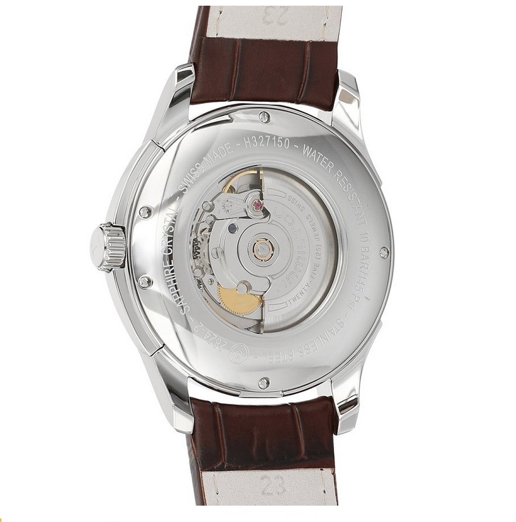 汉密尔顿Hamilton Men's H32715531 Jazzmaster Viewmatic Black Dial Watch 爵士系列机械男表,这款汉密尔顿机械男表,属于Jazzmaster爵士系列,风格大气洒脱,机械表是每个男人最好的首饰,不锈钢表壳搭配棕色小牛皮表带,黑色表盘上银色夜光指针和小时刻度,外缘分钟标记。ETA 2824-2瑞士产自动上链机芯(动力储存38小时,宝石数25,振频28,800摆),3点钟位置日期显示,防刮蓝宝石水晶表镜。背透设计,可欣赏机械运作。表壳直径44毫米,厚度12毫米,手工缝制真皮表带宽23毫米,防水深度100米。