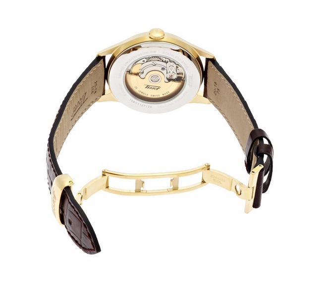 天梭Tissot Men's TIST0194303603101 Visodate Gold-Tone Stainless Steel Watch 唯思达系 男款背透自动机械腕表,这款天梭男表,是TISSOT 1957 复刻版,继承了经典的1957面盘设计,具有浓浓的复古腔调,搭配简约时标和复刻TISSOT Logo,延续瑞士的传统。配备星期和日期显示,醒目易读。金色不锈钢表壳搭配棕色牛皮表带,瑞士产ETA 2836-2自动上链机芯,储能42小时。防刮防反射蓝宝石水晶表镜,推拉式表冠。精緻细腻的表背透明镂空设计。表壳直径40毫米,厚度12毫米。表带宽20毫米。防水30米。