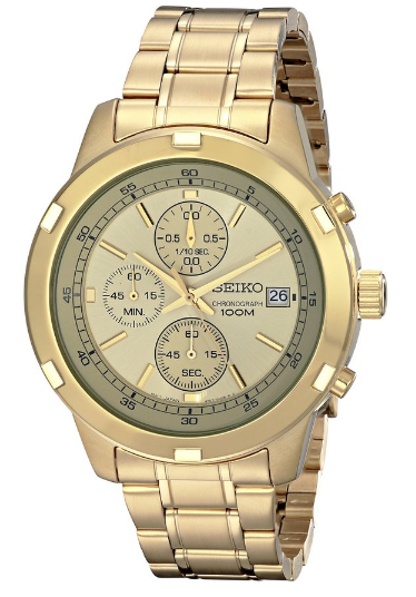 精工Chronograph三眼计时男表型号为SKS426,外观十分适合帅气型男佩戴,采用日本产4T57石英机芯,计时非常精准,可提供0.1秒,60秒和60分计时功能,带计时按钮,采用镀黄金不锈钢表壳和表带,显得高端大气,3点钟日期显示,实用性较强。表盘直径43mm,厚度10mm,大小合适,大多数男士的手腕都能hold住了,强化水晶表镜,防刮耐磨,即使长时间佩戴也不会刮花,100米防水还是比较靠谱的,可以戴着游泳,日常的生活防水更是不在话下!这款手表虽说是壕金色,但因为计时表盘等运动元素的加入,给人的感觉还是很时尚的。